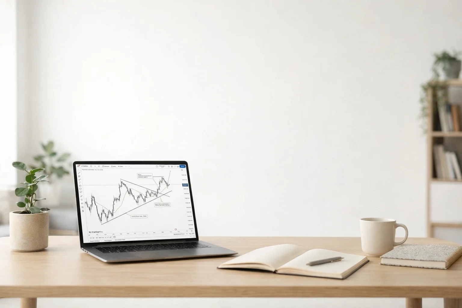 Visual: Clear desk with laptop, journals, and tea cup. A space to intentionally learn about day trading.